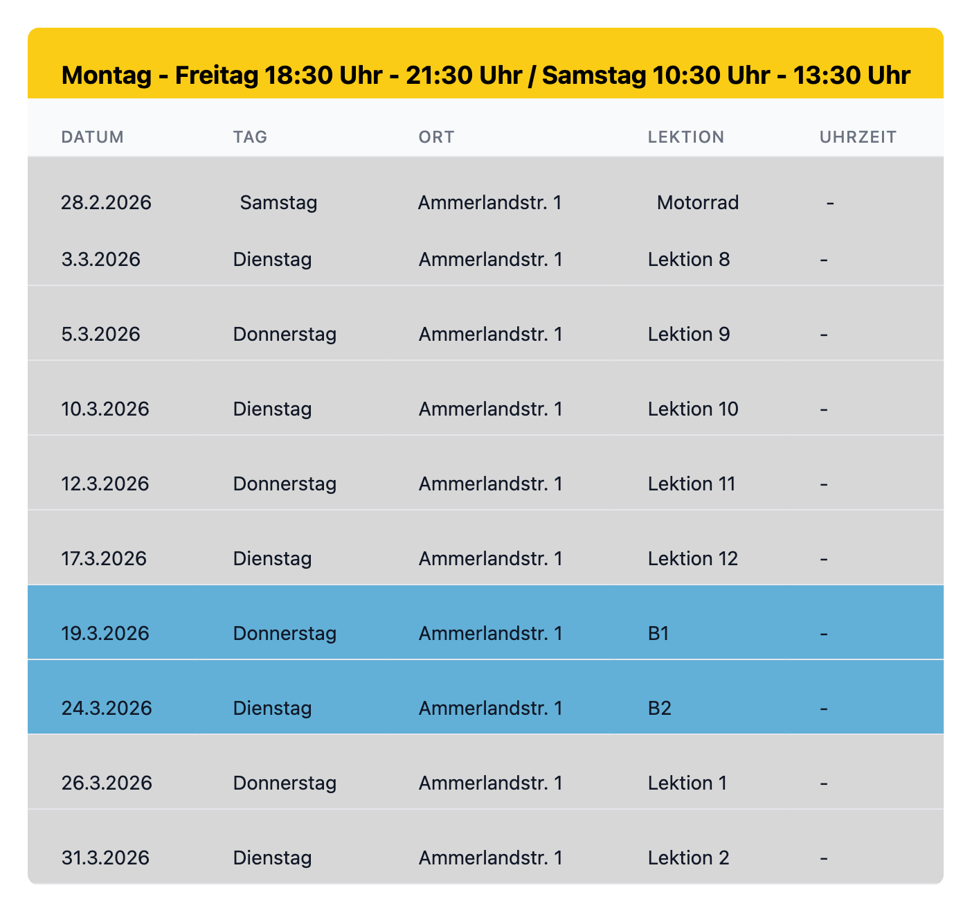 Wir bieten an unseren Standorten Trudering, Berg am Laim und Fürstenried an sechs Tagen pro Woche Theorieunterricht an.