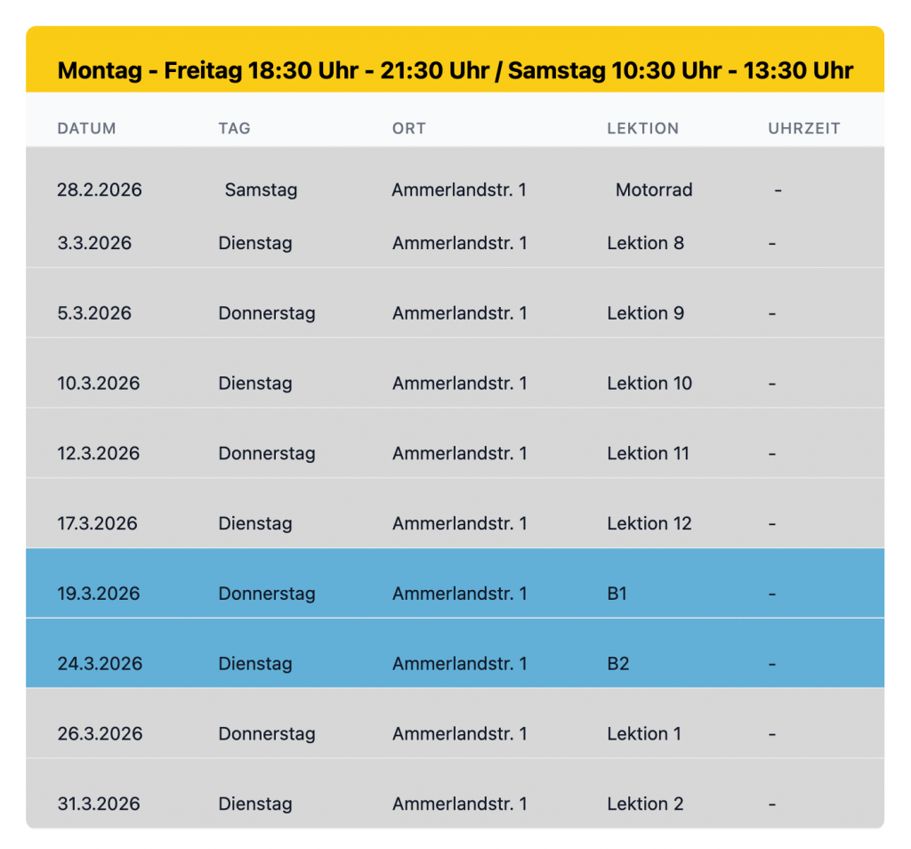 Der Unterricht findet an sechs Tagen pro Woche statt und deckt alle gesetzlich vorgeschriebenen Lektionen sowie ergänzende Themen ab, die dich optimal auf die theoretische Führerscheinprüfung vorbereiten.