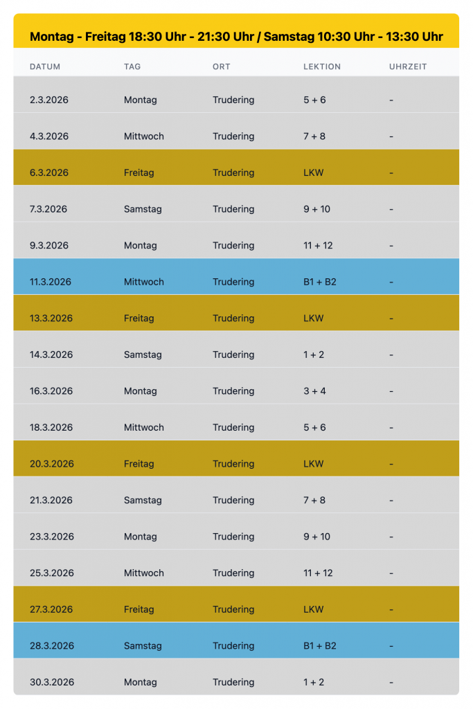 Unten findest du eine vollständige Auflistung aller Theorie-Lektionen für das Jahr 2026. Die Termine sind nach Monaten sortiert und enthalten Angaben zu Uhrzeit, Thema und Standort. So kannst du deine Teilnahme optimal planen.